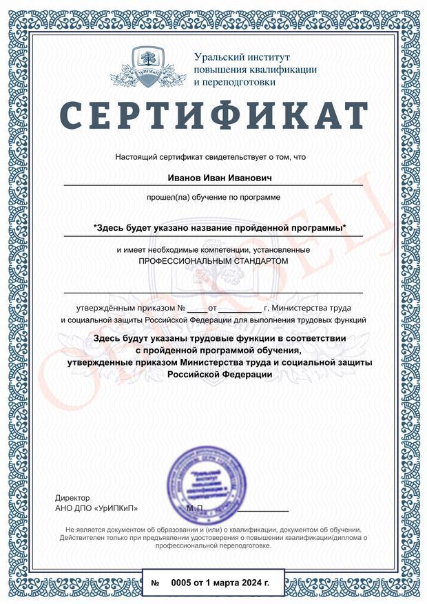Заполненные образцы выдаваемых документов есть в описании учебных курсов и на странице «Лицензия. Документы», а также на главной странице официального сайта АНО ДПО «УрИПКиП».
