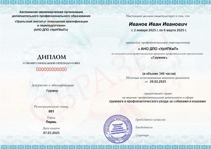 - Диплом о профессиональной переподготовке или сертификат о прохождении дополнительной образовательной программы «Грумер».