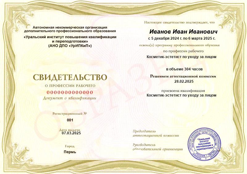 • Квалификация: Косметик-эстетист по уходу за лицом