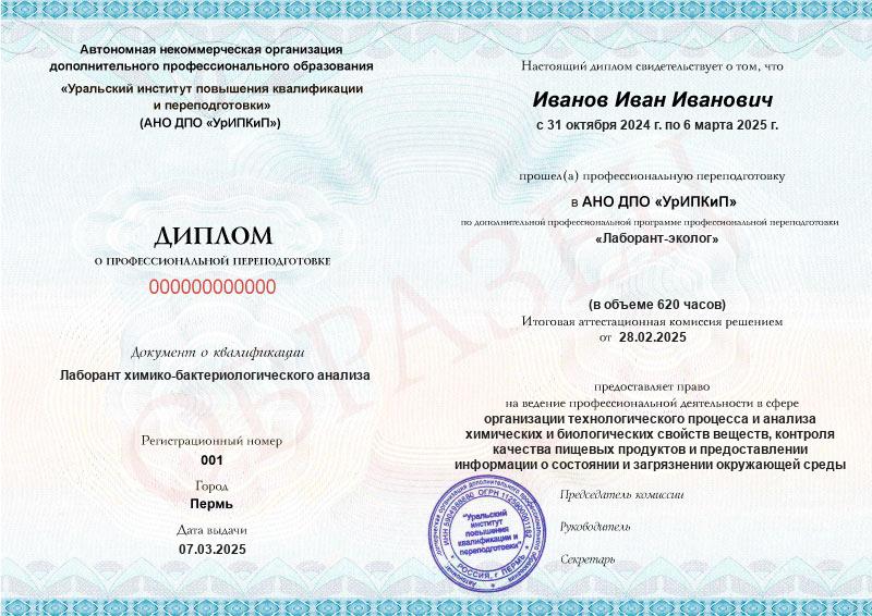 Учебный план программы профессиональной переподготовки «Лаборант-эколог» с присвоением квалификации «Лаборант химико-бактериологического анализа»