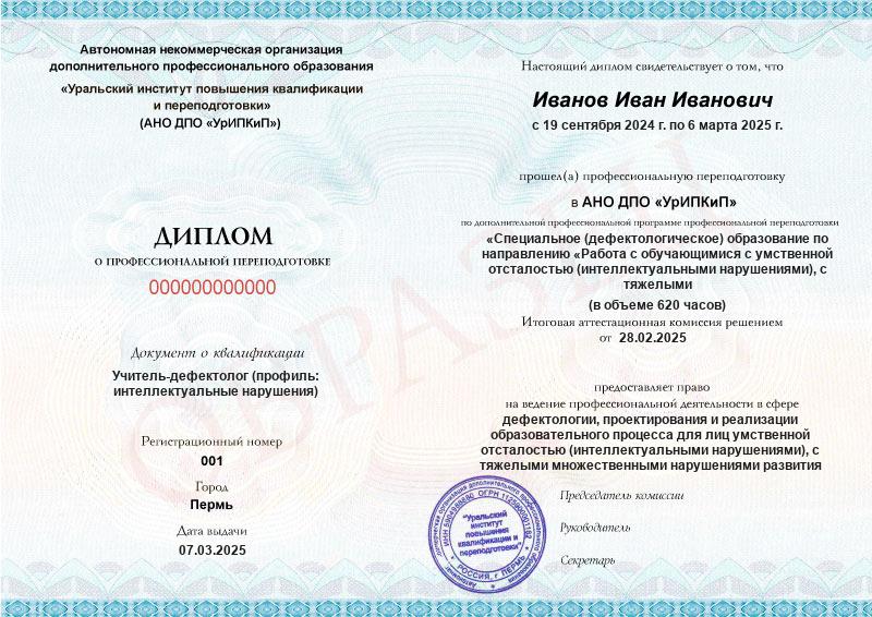 Курс обучения Специальное (дефектологическое) образование по направлению «Работа с обучающимися с умственной отсталостью (интеллектуальными нарушениями), с тяжелыми и множественными нарушениями развития». Олигофренопедагогика и олигофренопсихология (620ч)
