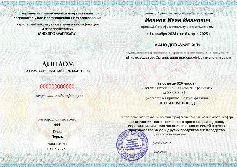 • Диплом о профессиональной переподготовке с присвоением квалификации «Техник-пчеловод». Вносится в Федеральный реестр документов об образовании.