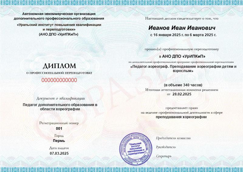 • Квалификация: Педагог дополнительного образования в области хореографии